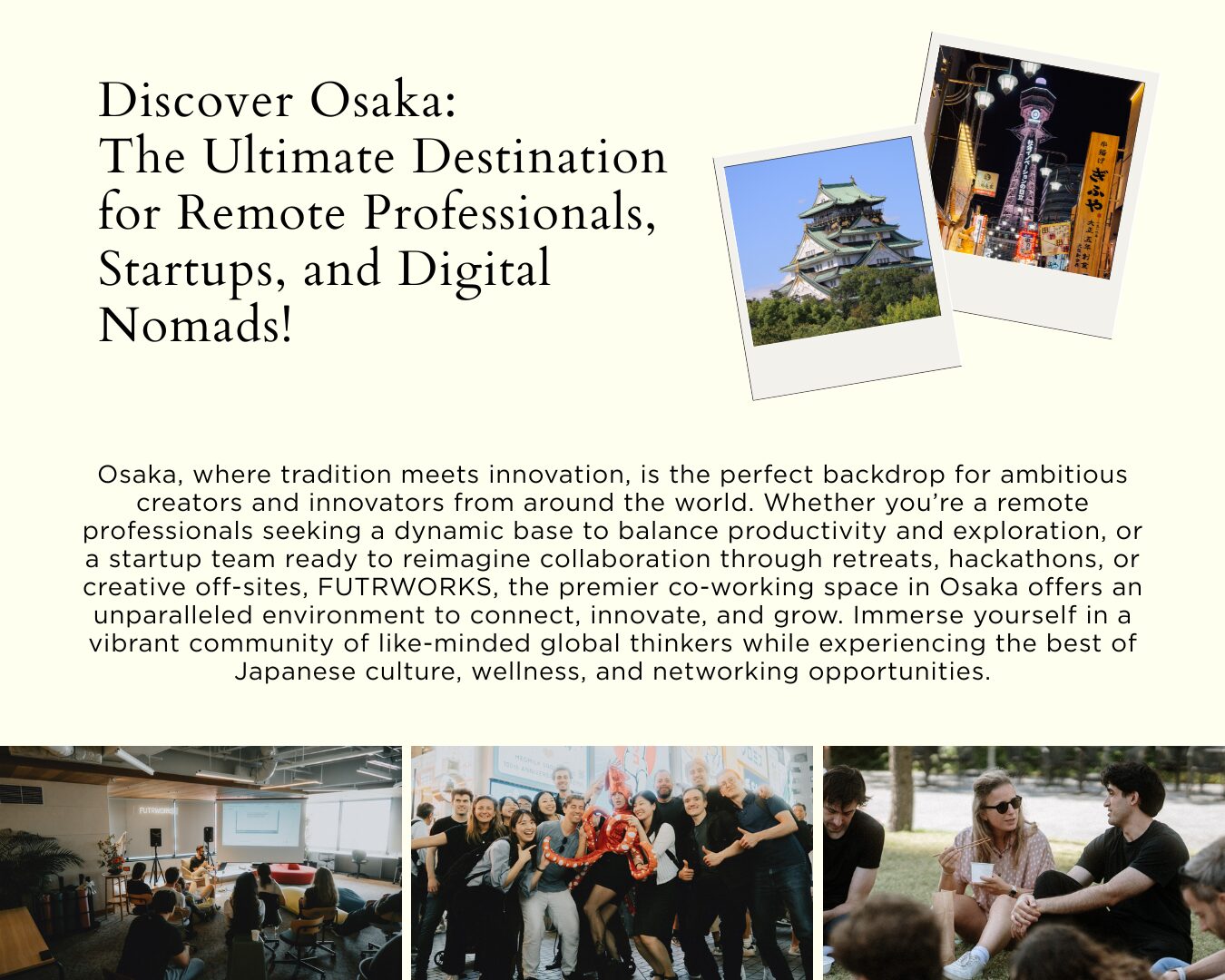 Osaka, where tradition meets innovation, is the perfect backdrop for ambitious creators and innovators from around the world. Whether you’re a remote professionals seeking a dynamic base to balance productivity and exploration, or a startup team ready to reimagine collaboration through retreats, hackathons, or creative off-sites, FUTRWORKS, the premier co-working space in Osaka offers an unparalleled environment to connect, innovate, and grow. Immerse yourself in a vibrant community of like-minded global thinkers while experiencing the best of Japanese culture, wellness, and networking opportunities.