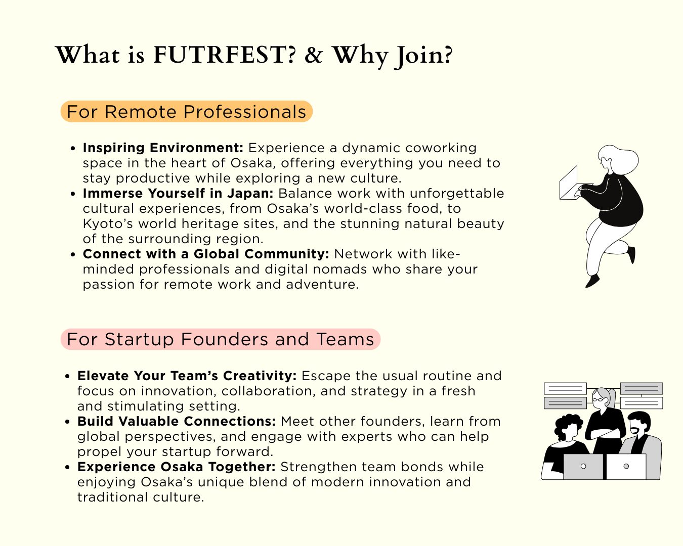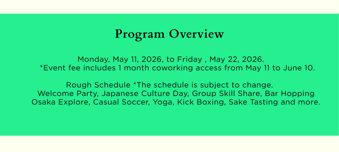 Whether you’re seeking productivity, inspiration, or new opportunities, FUTRFEST2026 in Spring is designed to help you thrive while experiencing the best of Osaka. Apply now and join a vibrant community of global innovators and creators in the heart of Japan! *Spots are limited.
